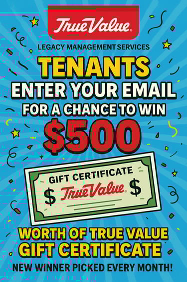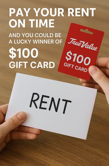 When you pay your rent on time, you’re not just staying on top of your housing — you’re also getting a chance to win! Each month, we’ll select one lucky on-time payer to receive a $100 True Value gift card. It’s our way of saying thank you for being a responsible and valued tenant. Stay on track, and you could be our next winner!
